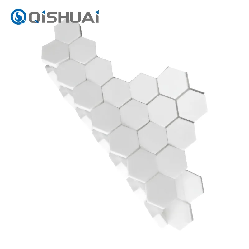 Shandong Qishuai Wear-Resistant Equipment Co., Ltd.-ren kalitate handiko Hex Alumina Zeramika Mosaikoak, ilustratzen den bezala, diseinu hexagonal bereizgarria du, fitxa karratu edo zirkular arruntetatik bereizten dituena. Aluminazko zeramikazko mosaiko teila hexagonal bakoitzak ertz leun eta leunak ditu xehetasun bikainekin argi eta garbi ikusgai.