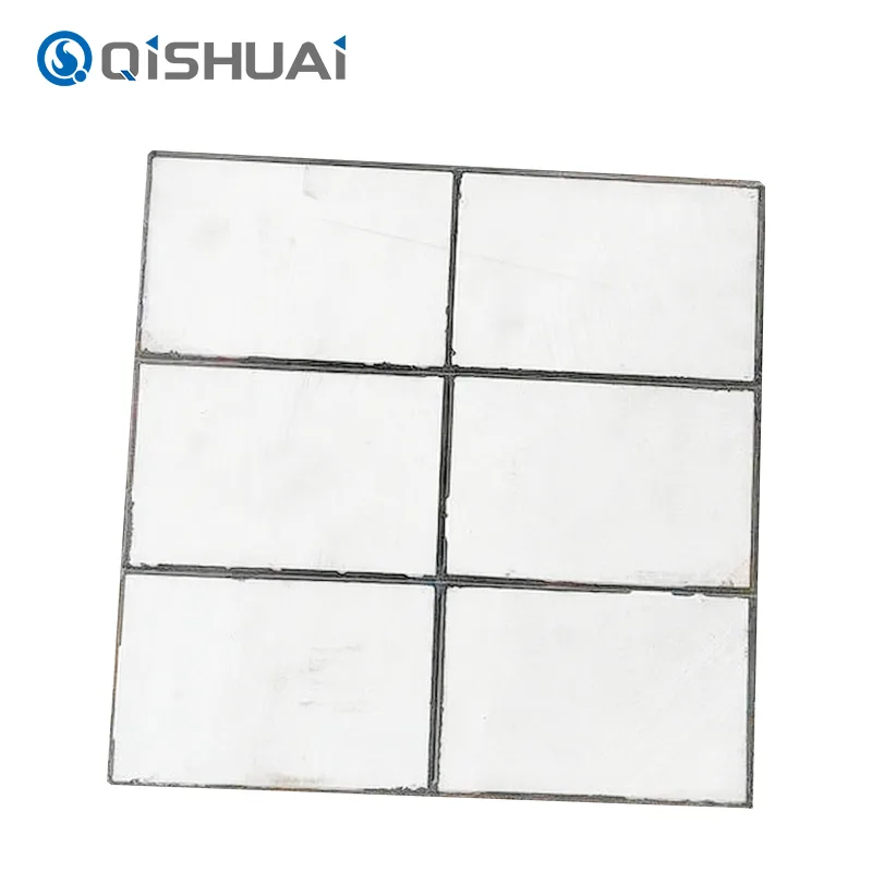 Shandong Qishuai Wear-Resistant Equipment Co., Ltd.-ren gomazko txertatutako zeramikazko higadura panelak bi geruza bereizi konbinatzen dituen diseinua erakusten du. Diseinu honek zeramikazko fitxak gomazko geruza batekin integratzen ditu. Geruza ezberdinek funtzio desberdinak eskaintzen dituzte baina konbinatuta funtzionatzen dute. Konbinazio honek ekipamenduaren higaduratik babesten du.